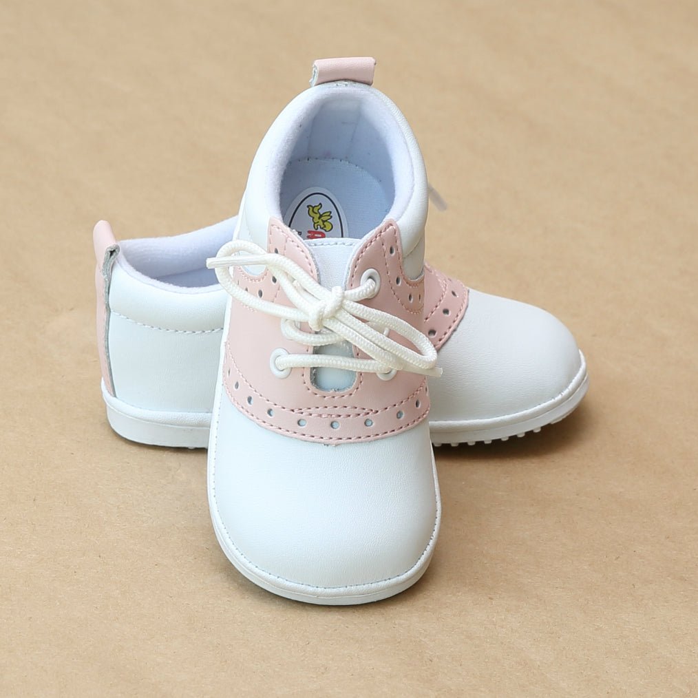 This pink leather shoe is a unique take on the classic saddle shoe and adds color to any outfit (as opposed to a usual navy or brown). Leave your little sweetheart looking smart in these oxfords, which are a perennial favorite.